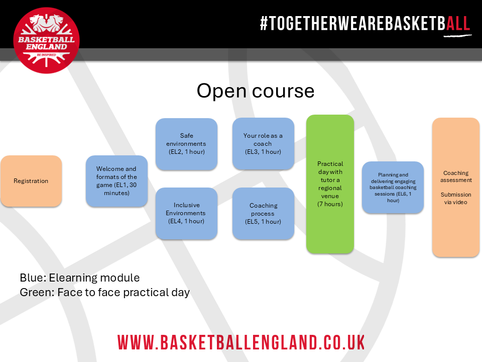- Attendance at 1 x face to face practical day with an approved Basketball England tutor at a regional venue