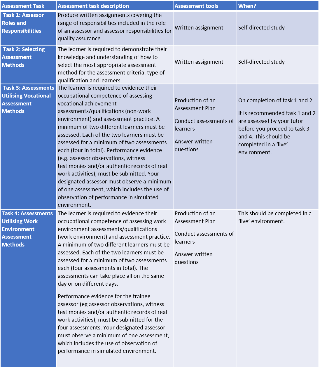 - An appropriate knowledge and understanding of assessing occupational competence and vocational achievement, which will be assessed via performance, tasks and assignments