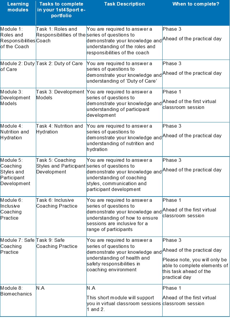 You will be required to complete online learning to support your knowledge and understanding to complete the tasks in your 1st4Sport electronic portfolio. Please note, you will need to complete your electronic portfolio in addition to the online learning.